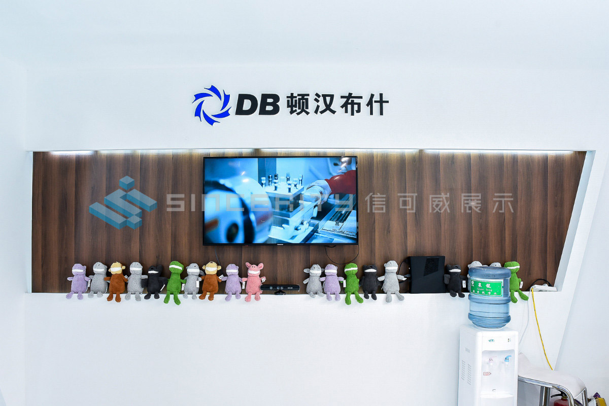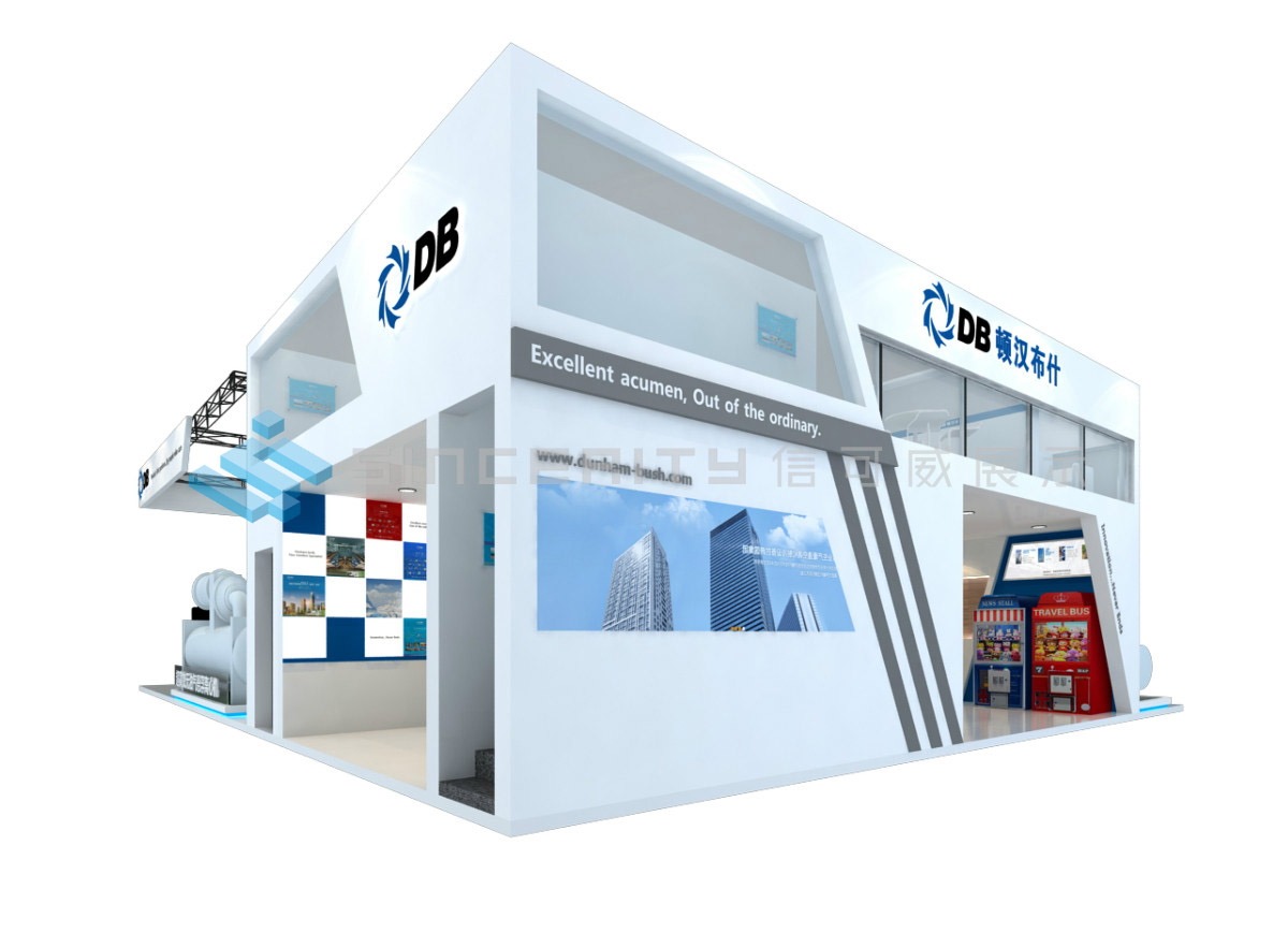 DB頓漢布什展臺設(shè)計(jì)以白為主色,藍(lán)色為輔色,展臺中央采用高科技折屏,著重突出DB品牌和產(chǎn)品的展示,契合DB全球品牌戰(zhàn)略的輸出,將情懷與科技融為一體。