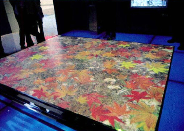 地面互動投影-展區里有塊IFLOOR互動投影系統,它可以將任何的地板轉換成一個多點互動的表面。該系統通過智能圖像傳感器捕捉人體的運動,軟件自動識別判斷人體的位置與運動狀態,并基于此產生不同層次的互動體驗。在這里,既可以漫步在潺潺流水中,微波蕩漾;又可以徜徉在楓樹林中,體味”秋風掃落葉” 的景致。